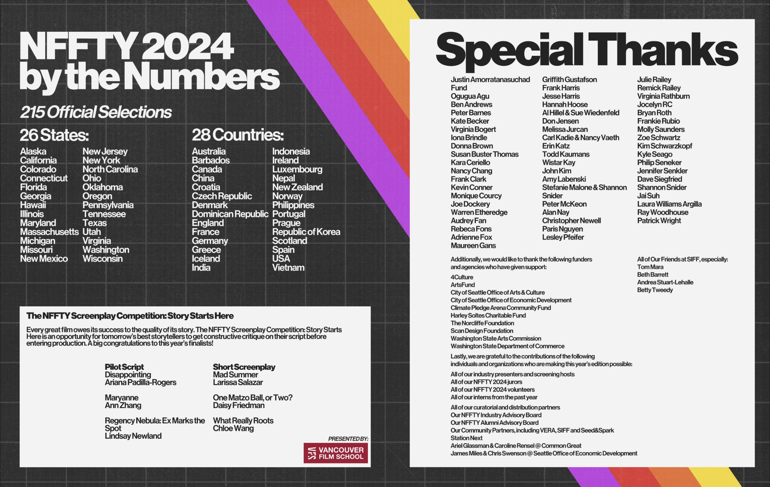 At the heart of NFFTY's 17th annual film festival, I orchestrated the creation of a captivating visual identity that resonated with the spirit of youthful creativity and cinematic exploration. Through dynamic posters, eye-catching merchandise, and meticulously designed festival badges, every aspect of the event reflected the vibrant energy and innovation of young filmmakers worldwide. The posters acted as vibrant invitations, teasing the diverse array of cinematic experiences awaiting attendees, while the merchandise, including two standout T-shirts, stickers, pins, and lanyards, served as both souvenirs and symbols of the festival's dynamic atmosphere.